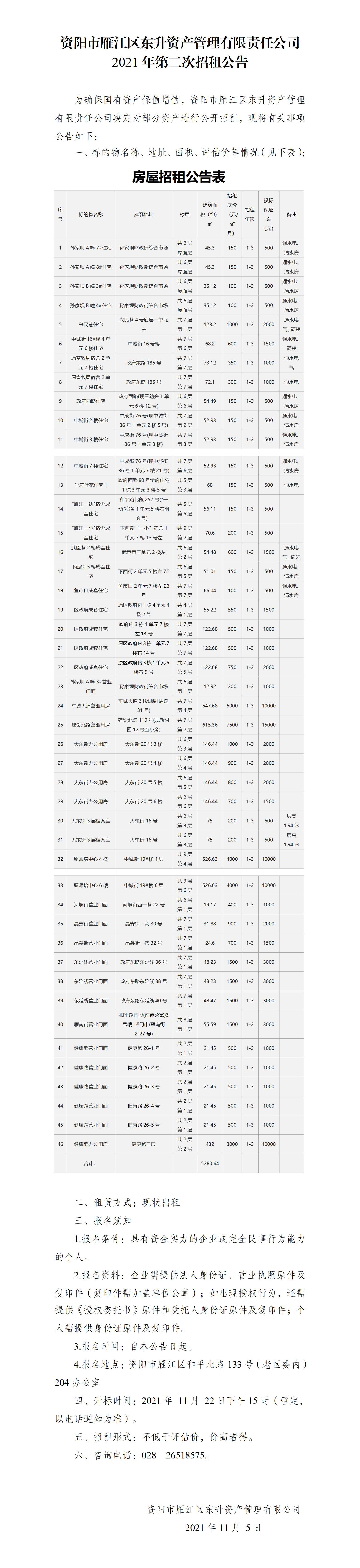 為確保國有資產(chǎn)保值增值,資陽(yáng)市雁江區東升資產(chǎn)管理有限責任公司決定對部分資產(chǎn)進(jìn)行公開(kāi)招租,現將有關(guān)事項公告如下: